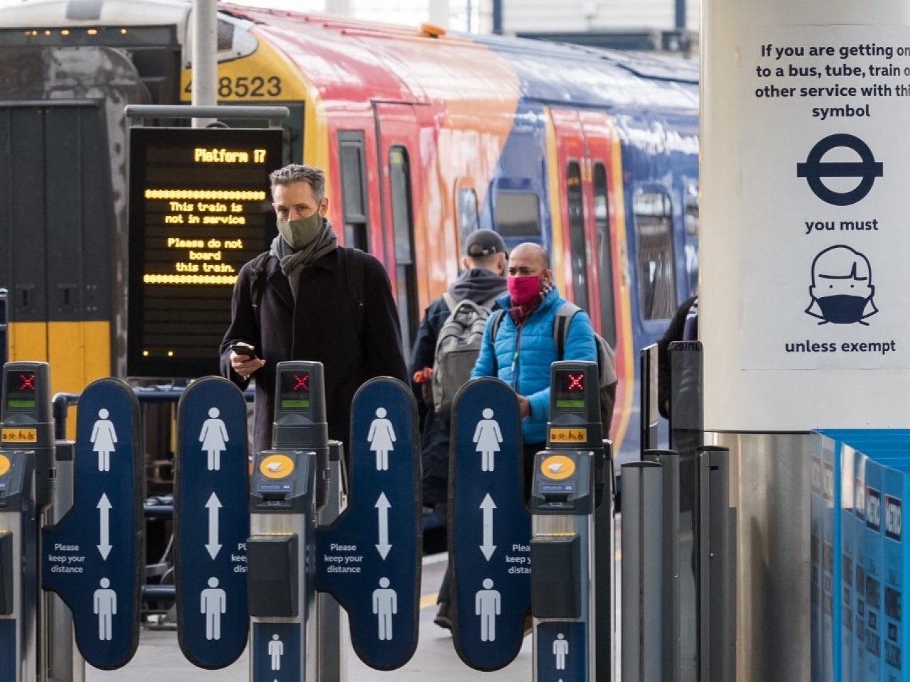 英國累計11宗Omicron個案,擴大接種疫苗計劃。當局規定民眾在公共交通要戴口罩。(法新社)