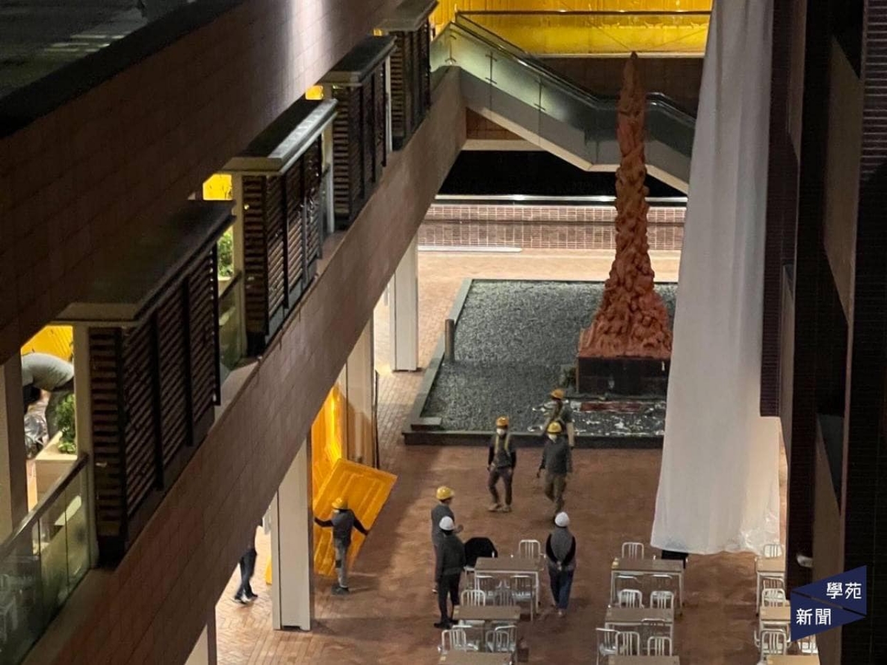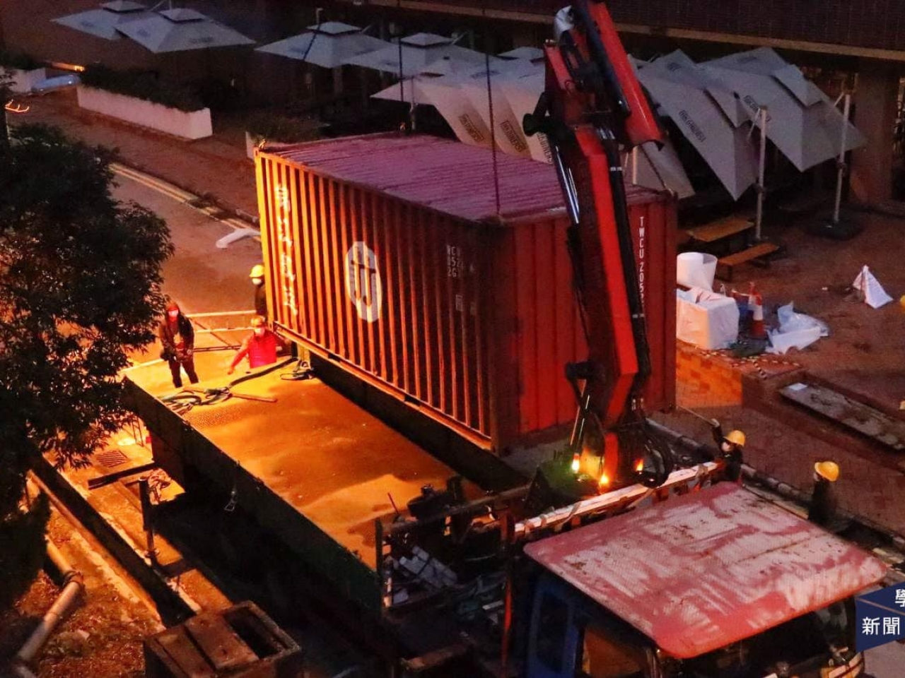 港大校園媒體學苑新聞昨晚在社交媒體上載相片,顯示有工人用圍板及布幕圍封雕塑。本台記者現場所見,大批工程人員深夜施工,不時傳出敲鑿聲,凌晨4時許見到有包好的部件運送出來,其後有另一件大型的部件運出,早上已運離校園。