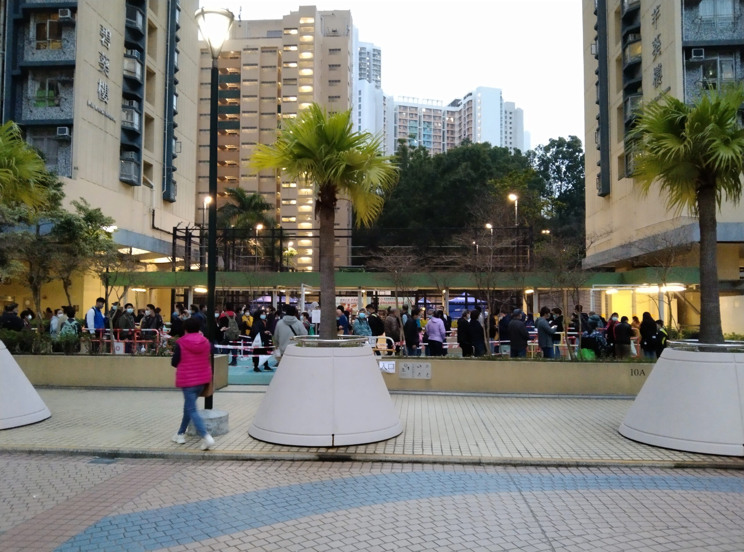 政府凌晨宣布,將映葵樓列為「受限區域」,居民須在處所等候,直至所有受檢人士完成檢測,檢測結果大致確定,才可離開處所,目標是晚上約7時完成行動。