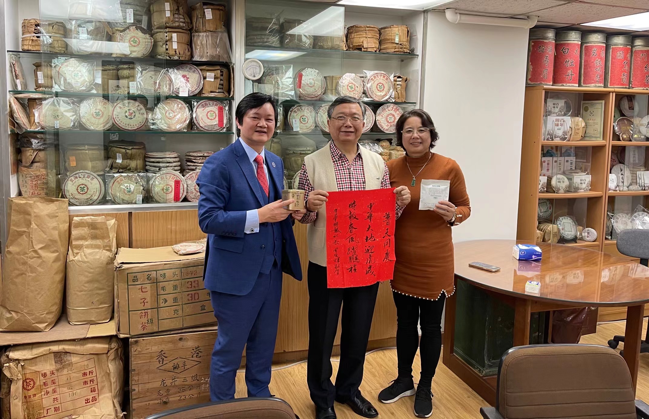 隨後,我們互贈禮物,他贈送陳年老茶,我贈送給他一張小春聯,參加品茶論道還有香港兩岸客家聯會會長江全孚、茶商施小姐,江會長帶來了香港名店的潮州卤水名菜,茶商施小姐下廚做了豆腐鯪魚湯和鹽水菜心,开心一起品嚐美食、喝起茶來⋯⋯