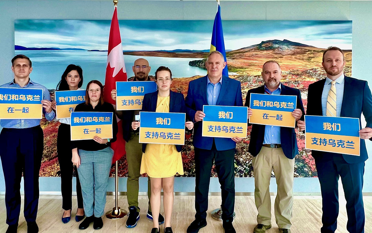 加拿大駐華使館外牆掛起了“我們支持烏克蘭”、“我們和烏克蘭在一起”的大標語,館內也升起烏克蘭國旗,使領館員工也拿着支持烏克蘭的標語拍照,加拿大駐華大使館將這些圖文廣泛傳播在社交媒體上。