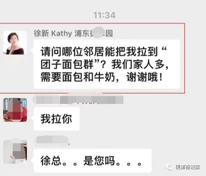 不只是升斗小民,網上也流傳着素有“風投女王”的今日資本徐新,在朋友圈求助需要麪包、牛奶,後續還發文稱,因爲兒子帶了朋友,家裏住了12人食物需求大,目前已經解決!她喊話,“大家一起加油,希望早日恢復正常生活。”