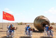 神舟十三號載人飛船,返回艙已經在東風著陸場預定區域成功著陸,著陸時呈現直立狀態。搜救直升機隨後抵達,支援人員抵達返回艙位置,打開艙門檢查。3名航天員報告身體狀態良好。