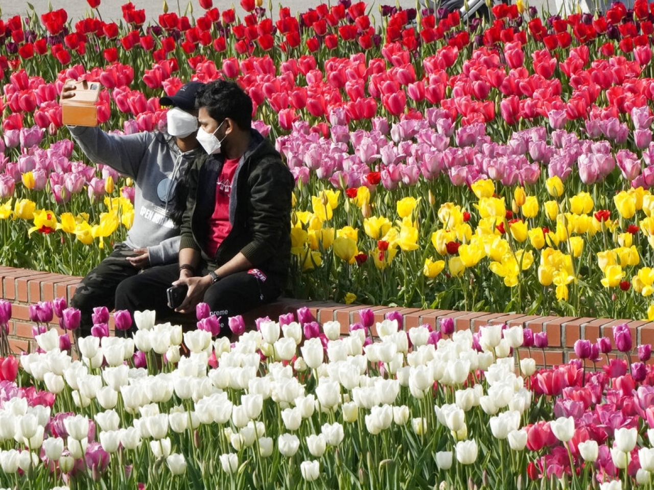在韓國一個公園,有民眾戴著口罩賞花。(美聯社資料圖片)