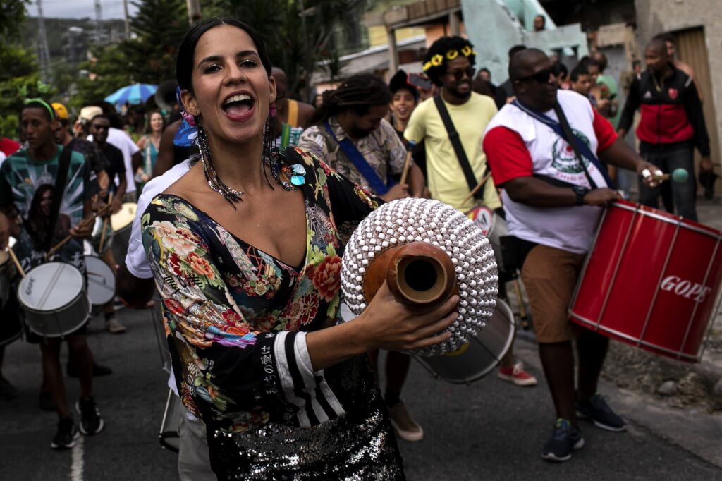 巴西衛生部長17日宣布結束與COVID-19相關的「國家重要公共衛生緊急事件」,人們將與病毒共存。圖為17日里約熱內盧市的嘉年華會,民眾未戴口罩在街上遊行。(美聯社)