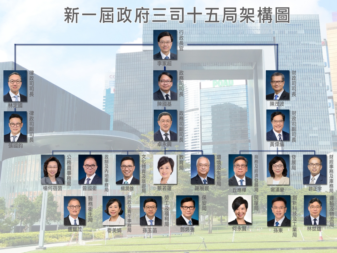 政策局由13個增至15個,新局長分別來自現屆問責官員、資深政務官、立法會及專業界別。教育局局長楊潤雄將出任新設的文化體育及旅遊局局長,許正宇留任財經事務及庫務局局長。兩名現任副局長升職,教育局副局長蔡若蓮升任局長,環境局副局長謝展寰出任新設的環境及生態局局長。