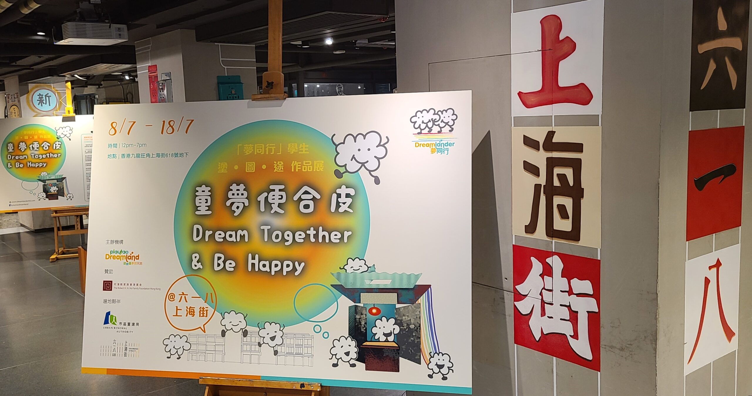 是次展覽名為《童夢便合皮:「夢同行」學生塗 ‧ 圖 ‧ 途 作品展》—「便合皮」,乃”Be Happy”的粵語音譯也;而「塗‧圖‧途」則分別代表學生們課堂上隨心自由的「塗」、揮灑畫出內心聲音的「圖」、與師父同學們於藝術路上同行的旅「途」。以一句港色英文、同音多義,道出夢同行計劃活動多元的特色、溫暖而又饒富人情味的關係與及當中盛載幸福感的真摯回憶。