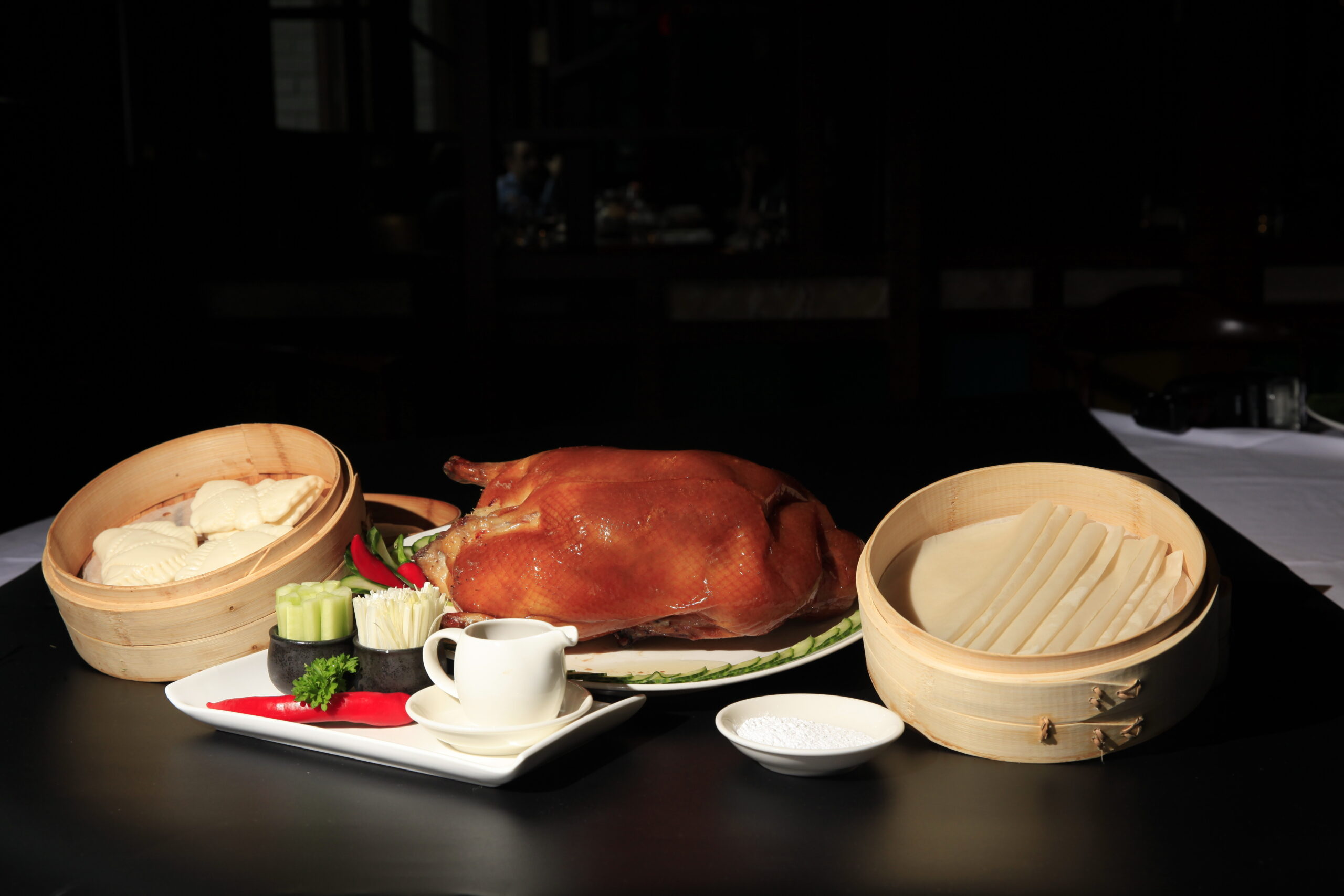 在蒽、黃瓜絲、甜麵醬和糖這四小碟配料中選擇你所喜歡的,用薄薄的面皮卷裹上,鴨皮香脆,鴨肉香酥與面皮、作料的香甜完美融合,美味佳餚的滿足感油然而升。店家還會送上一盤面餅,配烤鴨則有另外的風味。隨鴨奉送的每人一碗鴨湯,鮮美、清淡,特別爽口,可解油膩。