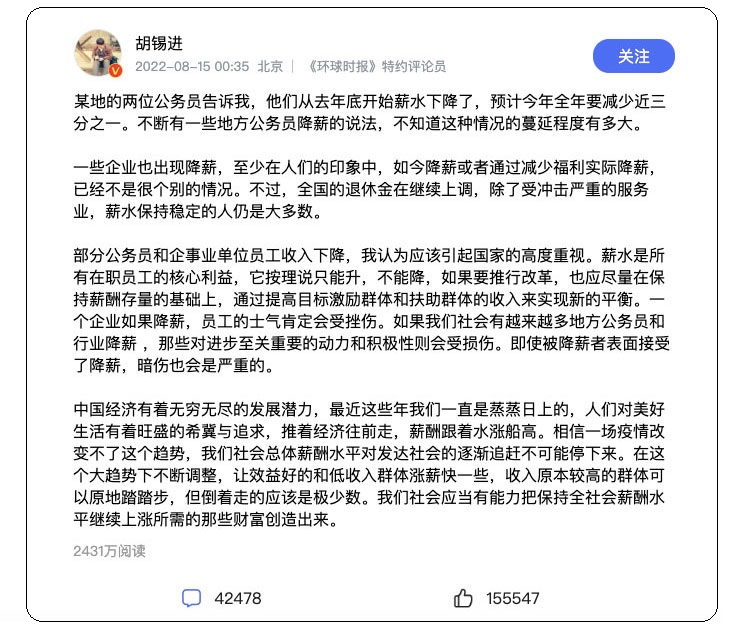 《環球時報》前總編輯胡錫進在網上發文寫道,有政府公務員告訴他,去年底開始薪水下降,預計今年全年要減少近三分之一,他認爲政府應高度重視。該文一天的閱讀量達兩千四百多萬,在四萬多條留言中,大部分支持公務員降薪,甚至希望裁減公務員。