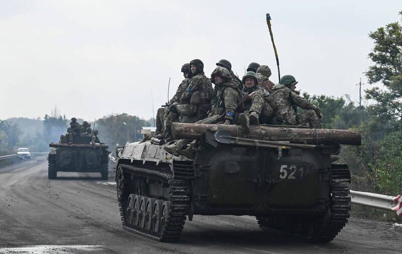 烏克蘭士兵乘步兵戰車進入順利收復的伊久姆市。(法新社)