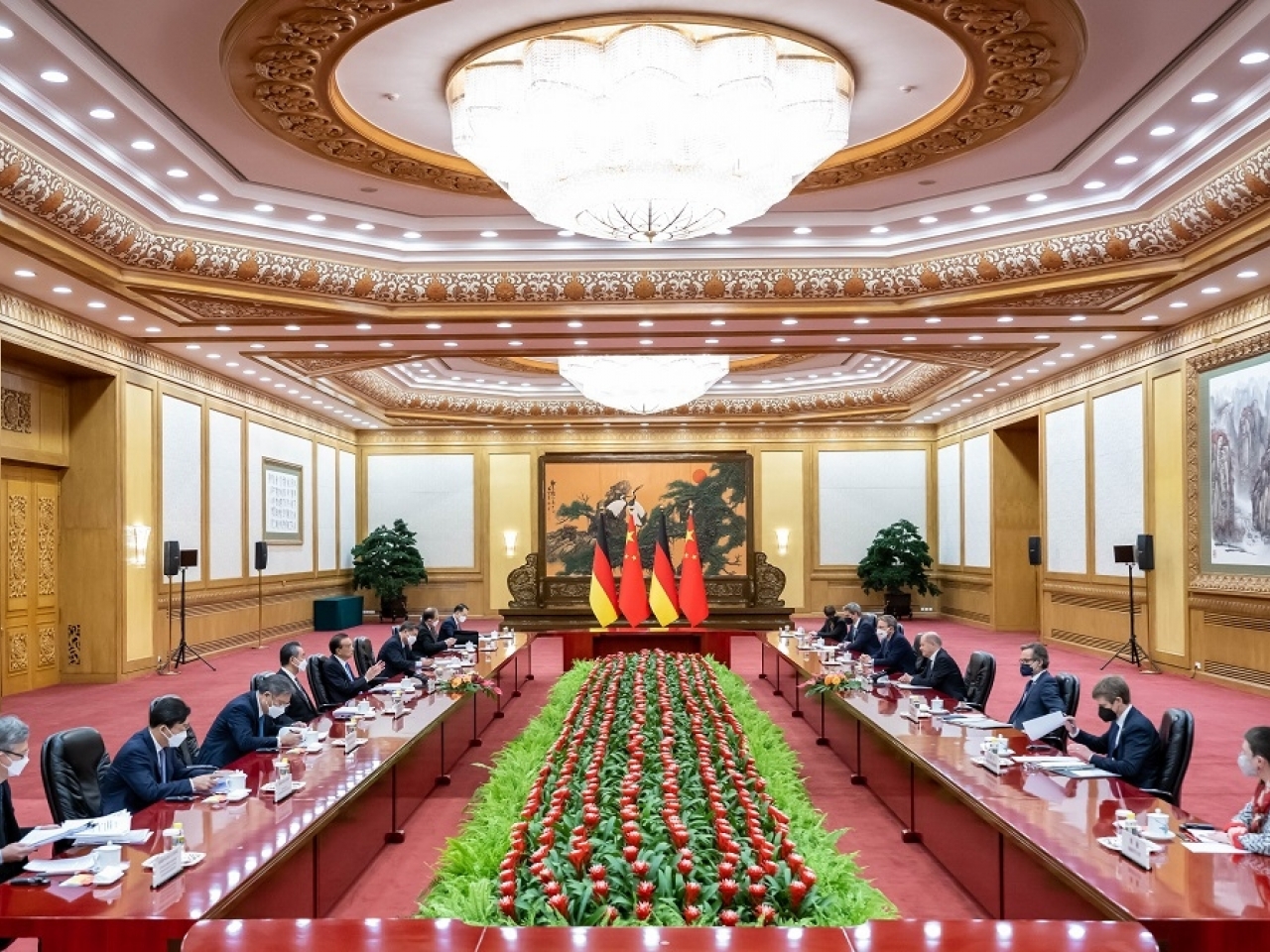 雖然沒有戴口罩,但習近平與肖爾茨沒有握手,且雙方與會者相對就坐於隔開的兩列長桌,保持了”安全距離”。