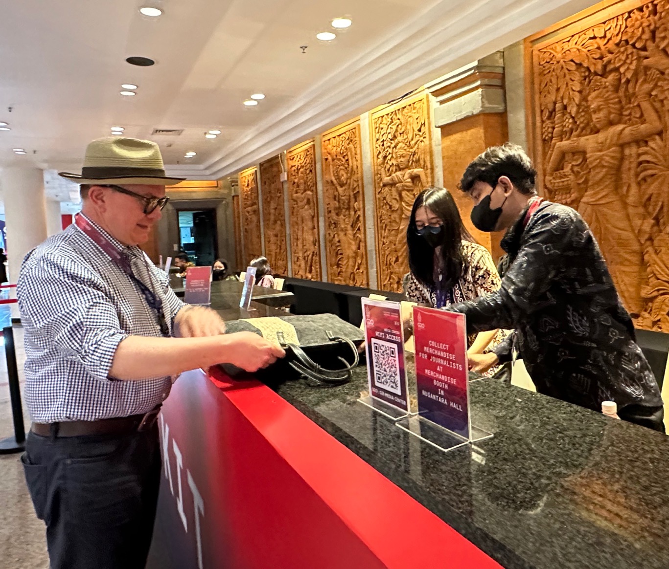 雖然新冠疫情在全世界已經漸漸收尾,但印尼當局面對疫情仍不馬虎,每隔一段時間,記者就必須接受快篩檢測,記者中心外也設有大型快篩站。為加強治安,會場隨時有數百名身穿軍服的士兵巡邏,成為工作之餘相對肅殺的一幕。