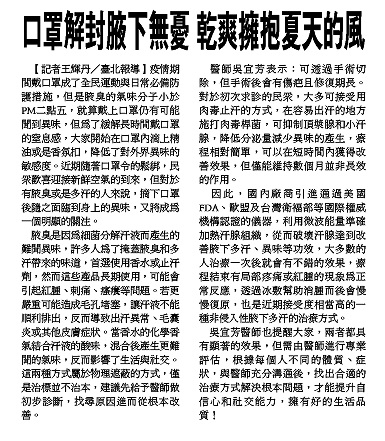 【記者王輝丹/臺北報導】 疫情期間戴口罩成了全民運動與日常必備防護措施,但是腋臭的氣味分子小於PM二點五,就算戴上口罩仍有可能聞到異味,但為了緩解長時間戴口罩的窒息感,大家開始在口罩內滴上精油或是香氛扣,降低了對外界異味的敏感度。近期隨著口罩令的鬆綁,民眾歡喜迎接新鮮空氣的到來,但對於有腋臭或是多汗的人來說,摘下口罩後隨之面臨到身上的異味,又將成為一個明顯的關注。