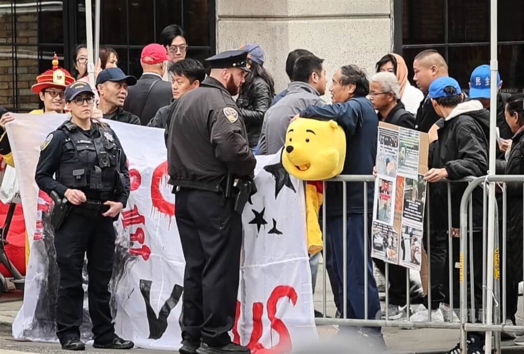 下午三點左右,約有三百多人聚集在瑞吉飯店前面街口,舉牌抗議,來自中國的訪民與北京僱來的小粉紅發生激烈對峙。據美國之音(VOA)報導,中國保安團隊還對現場抗議民眾大打出手,在街道上動粗,多人受傷。