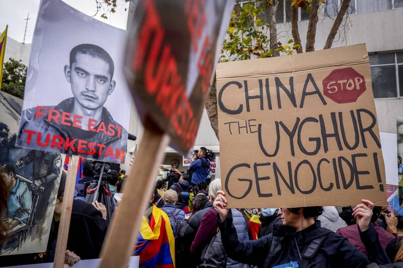 今天灣區飄雨,各地抗議活動氣氛熱烈,中國駐舊金山總領事館外近500人,包括大批西藏人士,還有部分新疆、香港以及台灣人聚集示威。台灣人高舉搭配台灣黑熊圖案的標語,上面寫著「我是台灣囡仔」,表達對獨裁的抗議。另有人舉著「台灣獨立」的標語現身人群。