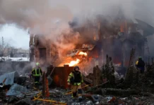 俄羅斯空襲基輔期間,一架無人機撞擊建築物後引發火災,消防員正在撲滅火災。-218x150.webp)