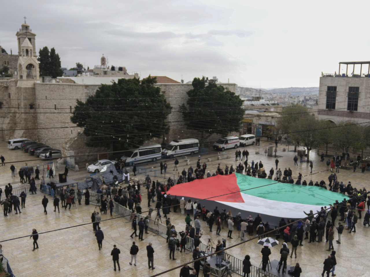 一面巨大的巴勒斯坦旗幟在市中心展開,一幅横額寫上「伯利恆的鐘聲為加沙停火而敲響」。