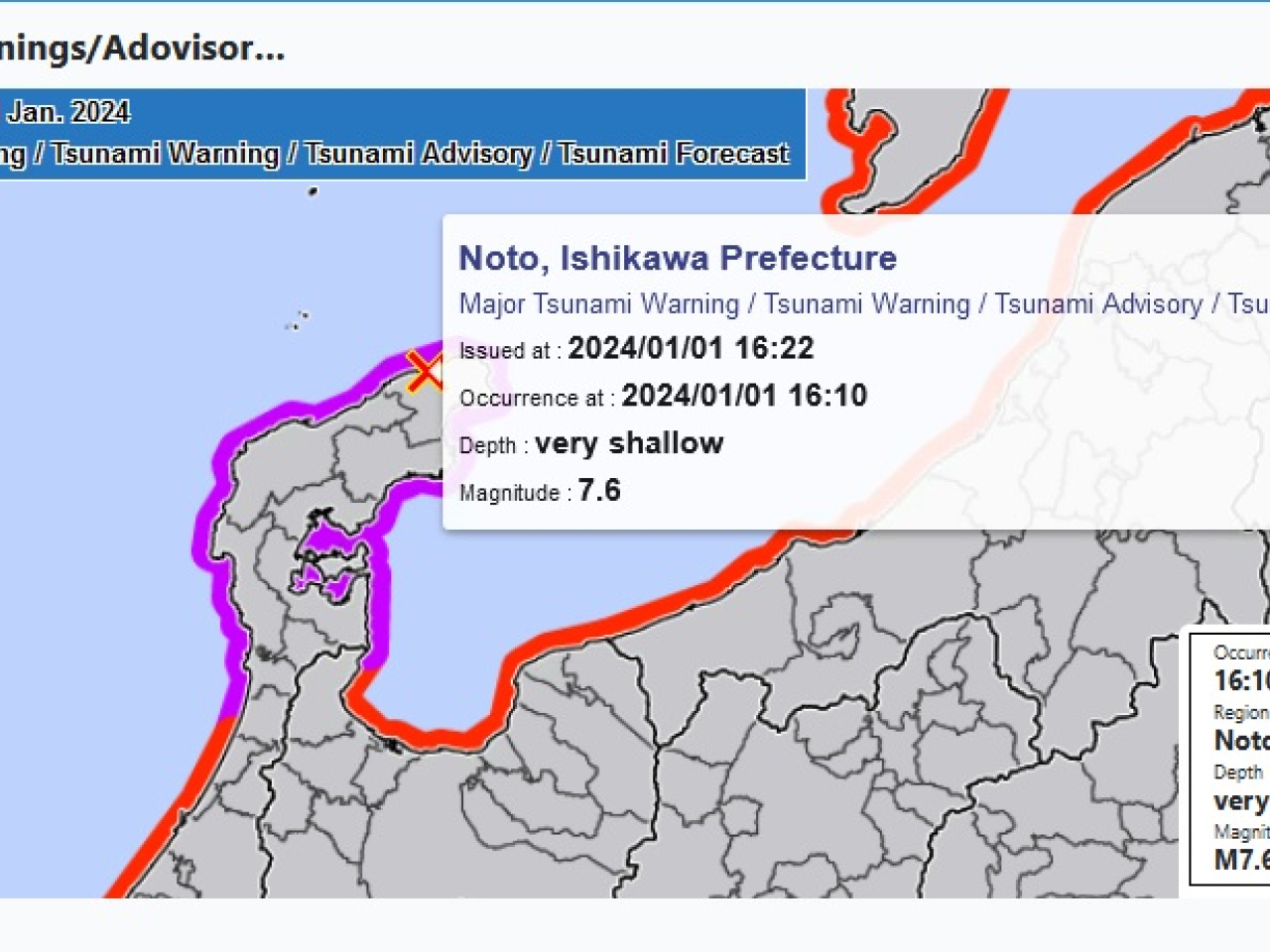 氣象廳表示,海嘯已陸續抵達日本沿岸,下午4時21分石川縣輪島市已被觀測到逾120公分海嘯;富山縣富山市下午4時23分也被觀測到80公分海嘯;新潟縣柏崎市下午4時36分觀測到40公分海嘯。