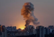 俄羅斯空襲基輔期間,一架無人機撞擊建築物後引發火災,消防員正在撲滅火災。-218x150.webp)