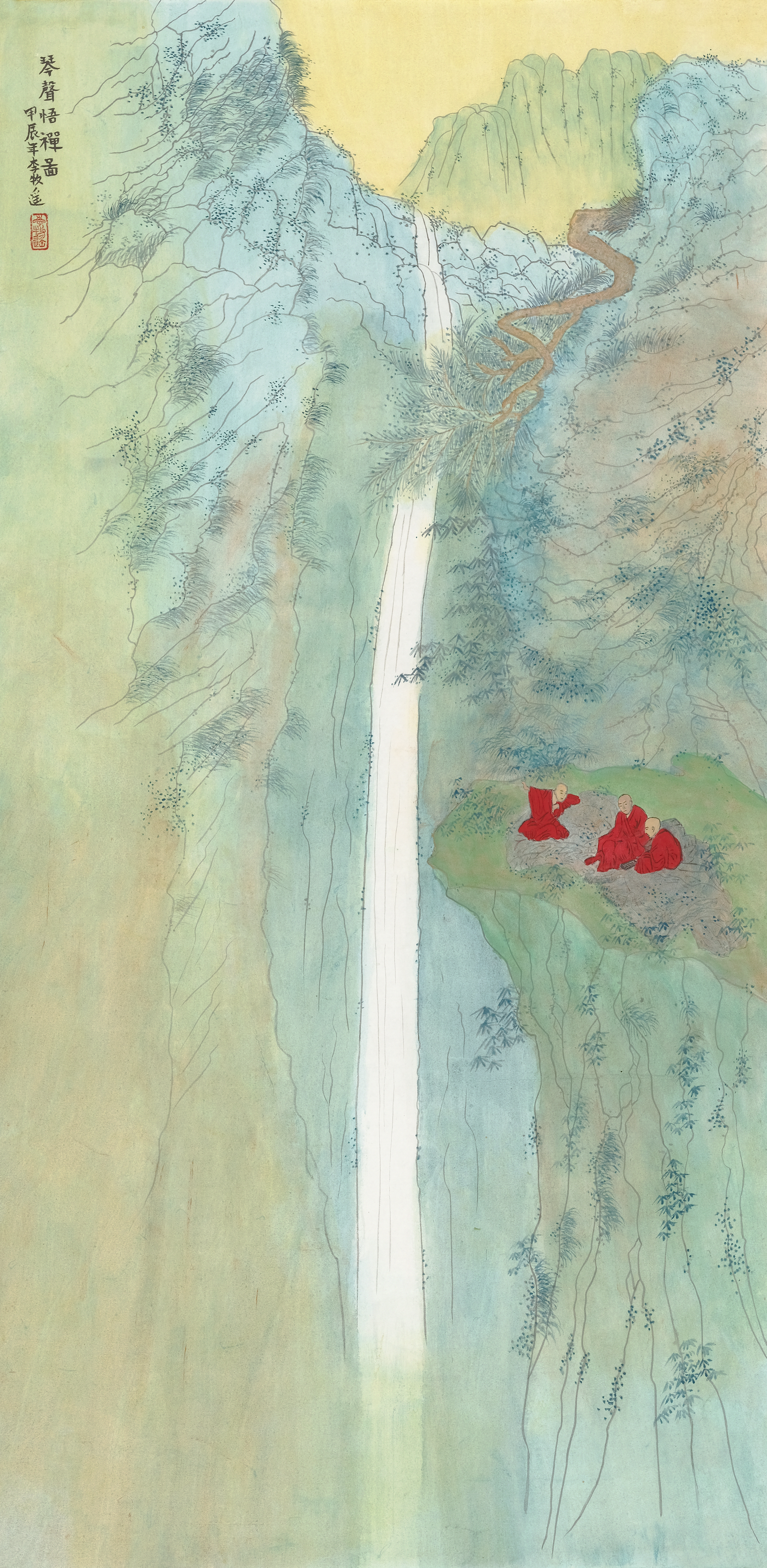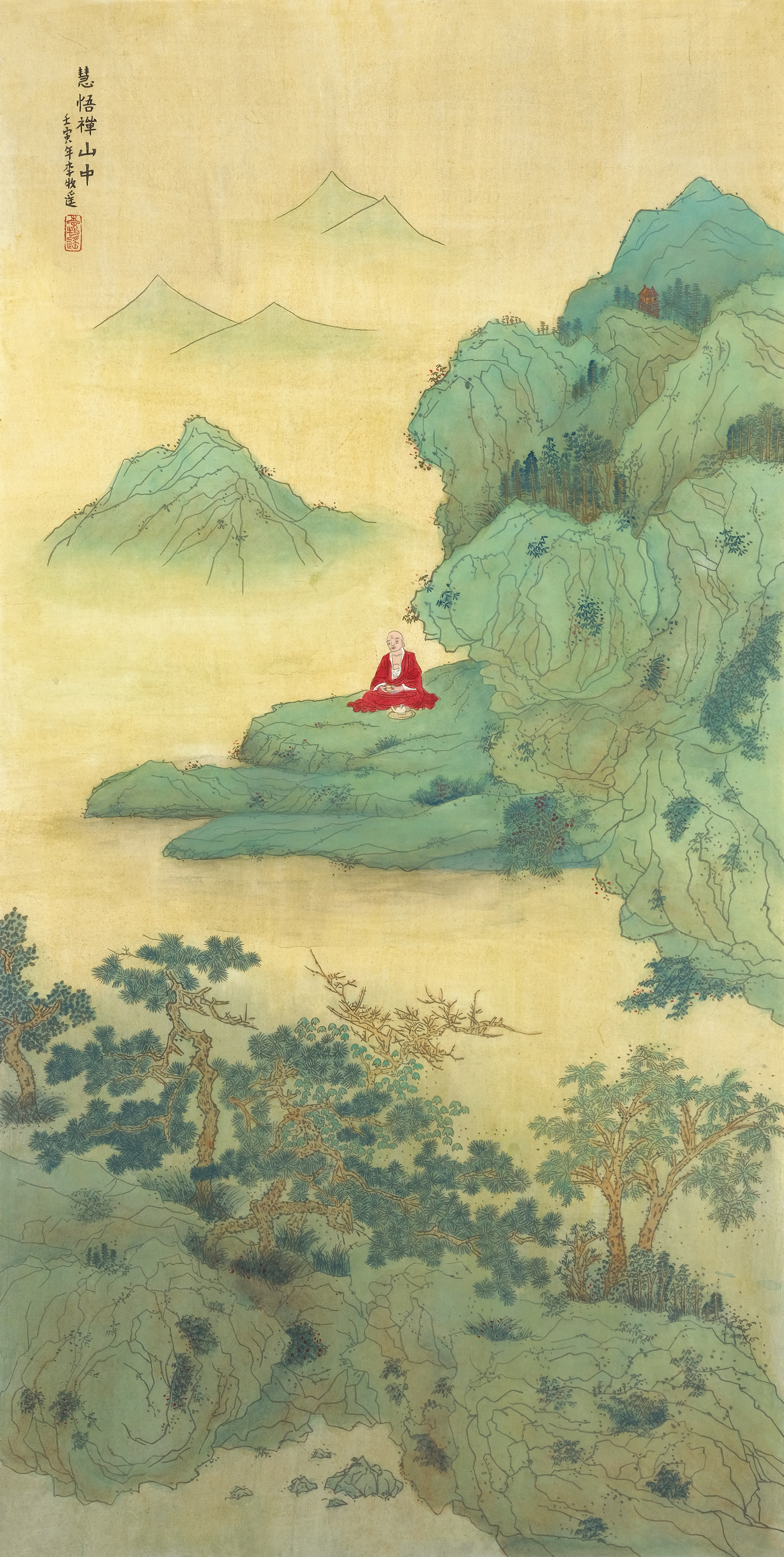 眼前首先映入眼簾的,是一幅幅濃墨重彩的紅衣羅漢禪修圖。傳統工筆勾勒下的身姿安詳靜謐,彷彿融入了山水之中,恍然忘卻塵凡。但細看之下,卻又透出一抹幽微的寫意筆觸,勾勒出羅漢內心深沈的禪悟。這是李牧遙巧妙融合傳統與創新的傑作。