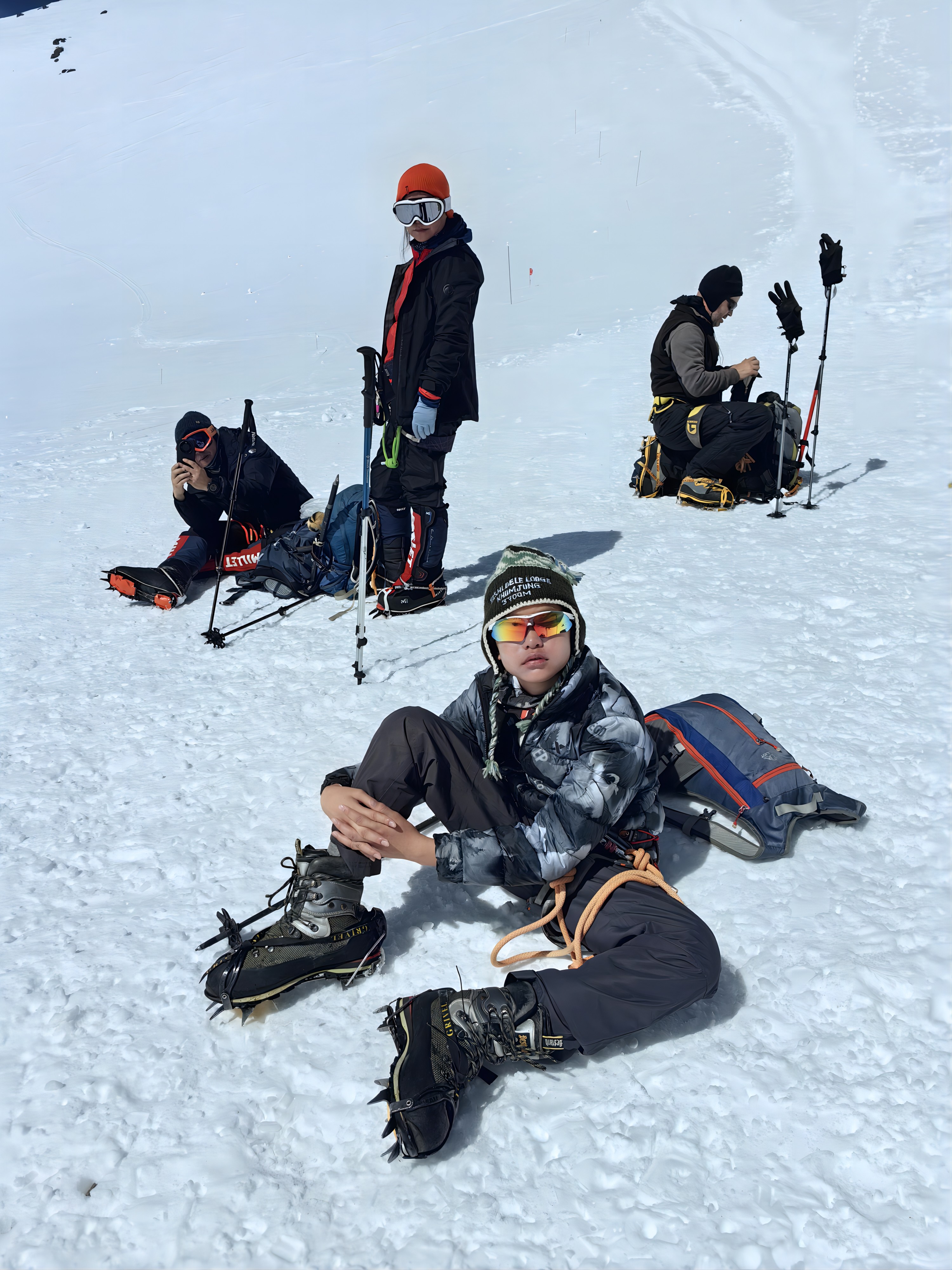 淩晨3點,周雙留父子和金海創山鷹隊一行五人,在三個嚮導的帶領下,高山靴綁上冰爪,踏碎冰雪,一步一個腳印,在黑暗中向山頂進發。周驛宸在日記中回憶了攀登出發時的情景,“天還很黑,只有天邊的一抹紅霞。所以我們都要戴頭燈,而黑暗的天空也加大了我們的登山難度。”
