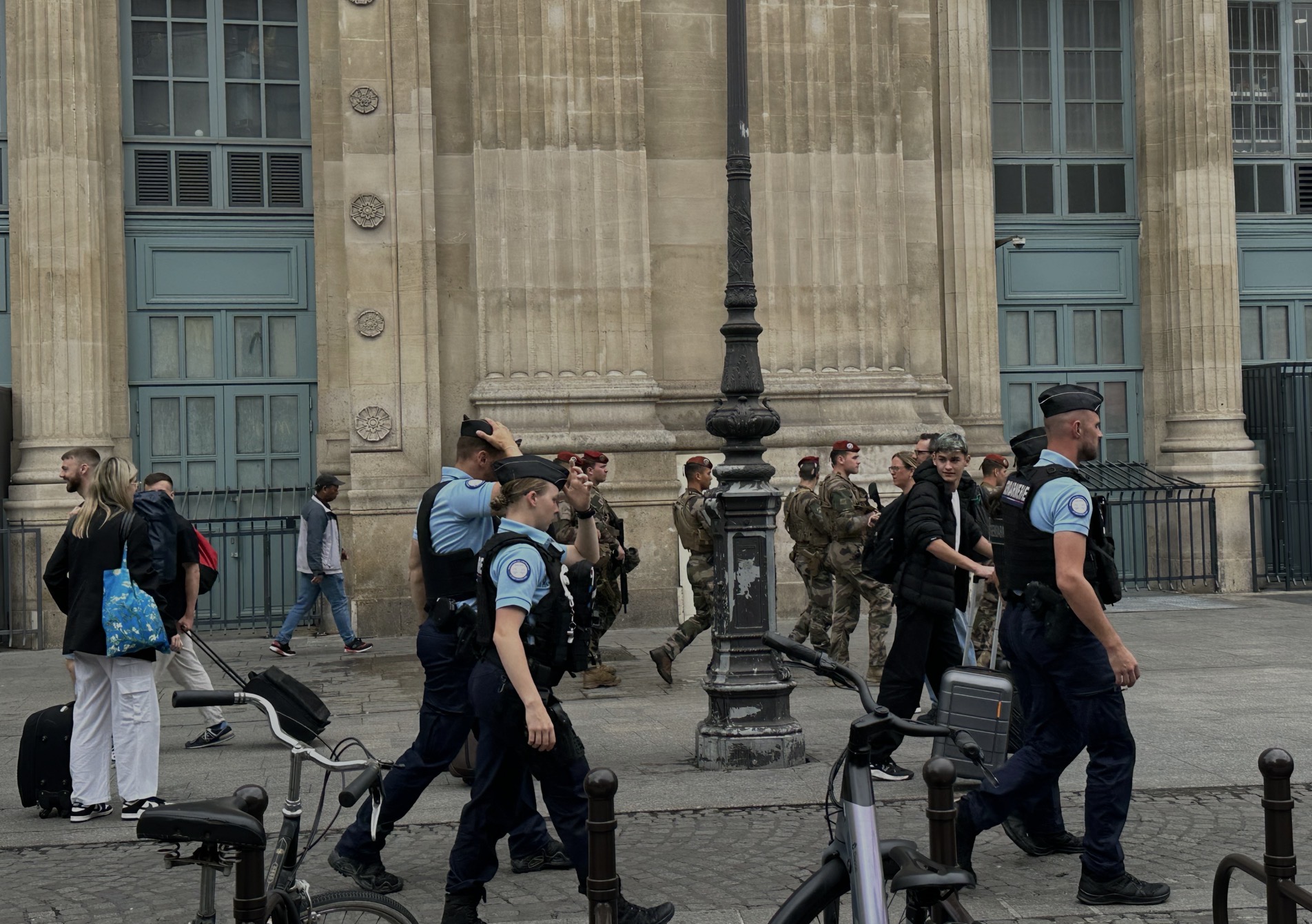 車站廣場及候車大堂,有持槍警員巡邏。車站告示牌顯示部份路線列車延誤45分鐘至1小時。