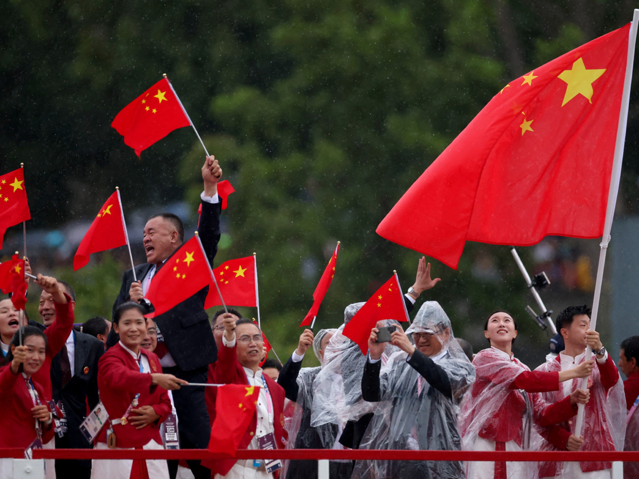 巴黎奧運在雨中開幕,升起奧運五環旗時出現烏龍事件,把旗幟倒掛。象徵五大洲的彩色奧運五環是「上三下二」排列,但升旗時可見倒轉了,變成「上二下三」,升旗手未有發現,亢奮及熱情的觀眾也不會發現。
