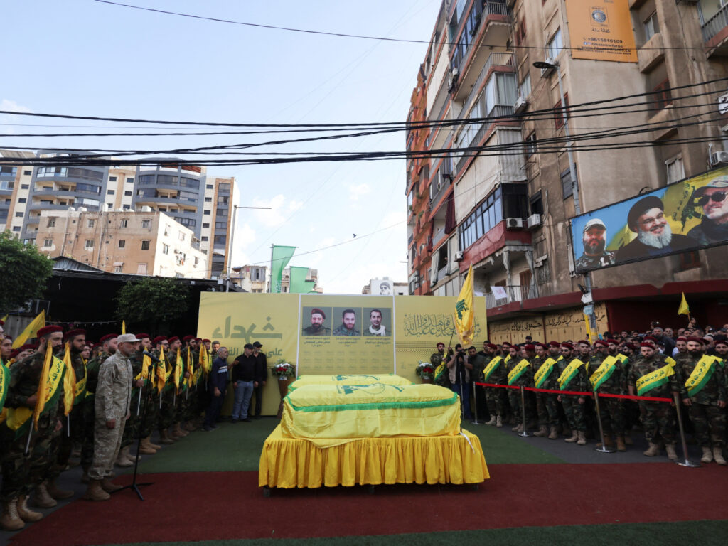 部分在以軍襲擊貝魯特南郊行動中喪生的真主黨成員舉殯。(路透社)