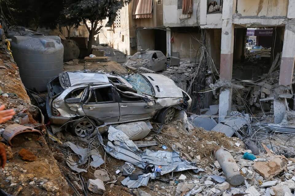 黎巴嫩貝魯特20日遭以色列襲擊後房舍車輛毀損情況。(路透社)