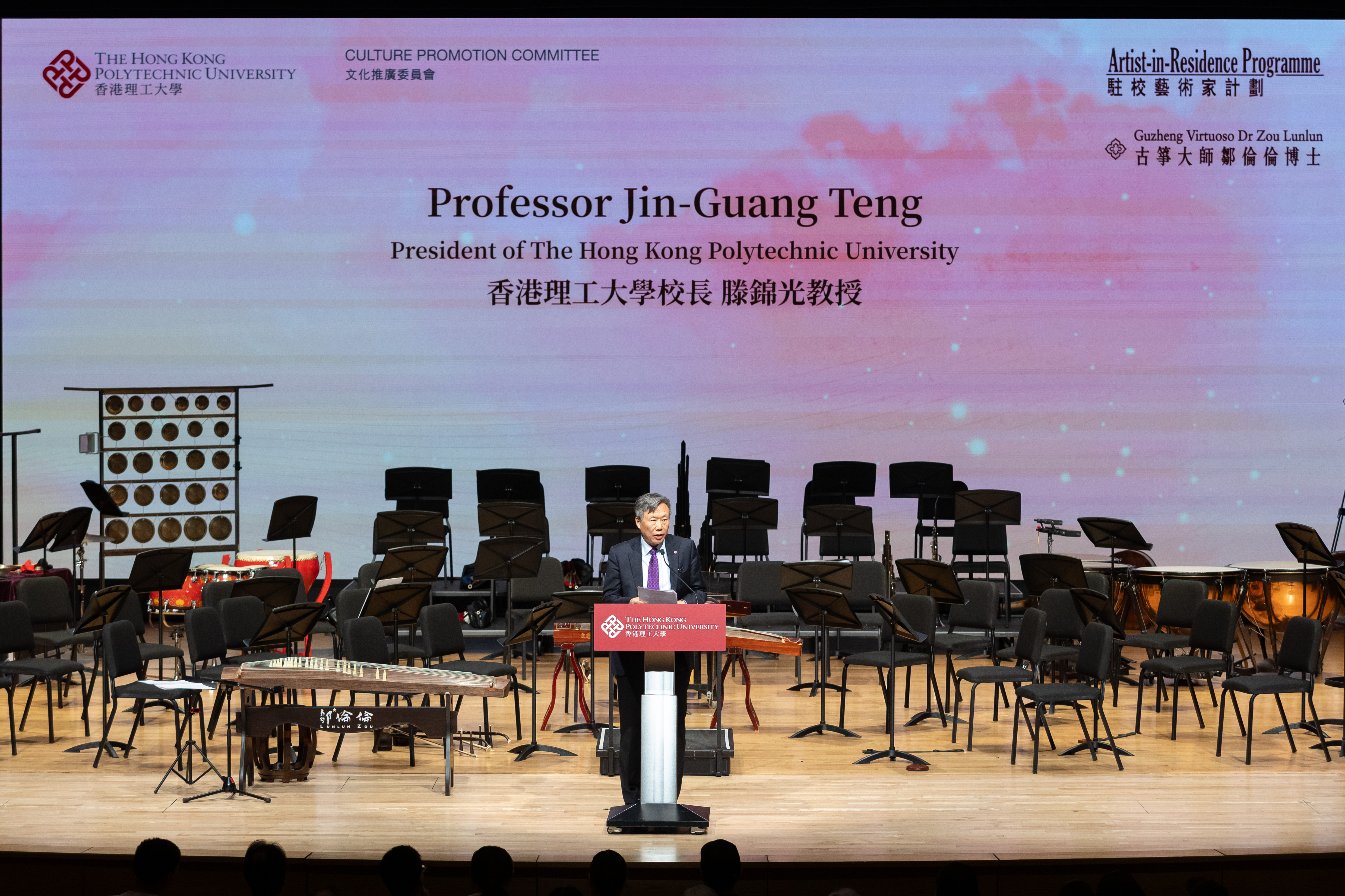 香港理工大學校長滕錦光滕在講話中強調了香港理工大學「駐校藝術家計劃」的重要性,自1999年以來,該計劃持續為校園注入藝術活力。滕校長指出,透過邀請各領域的知名藝術家,校園的文化與藝術生活得以蓬勃發展。