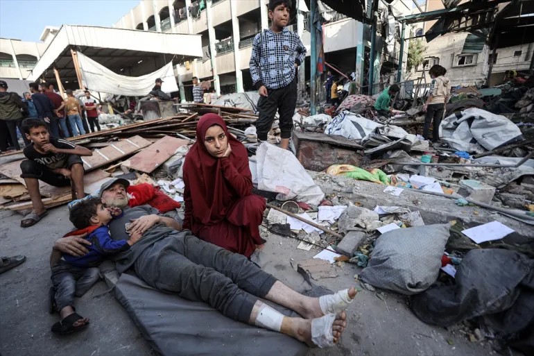 法赫米·賈賈維學校本週一在以色列的襲擊中被摧毀,一家人在學校旁等候 - 自周一凌晨以來,以色列對加薩走廊的襲擊已造成至少81人死亡,其中53人在加薩城喪生。