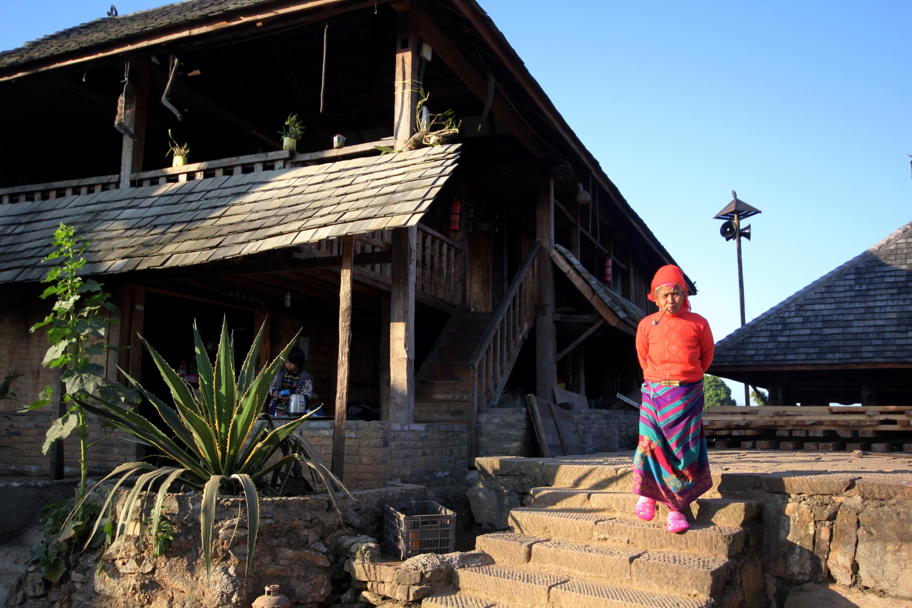 我先後去過景邁山兩次,兩次都在糯幹寨投宿。第一次是好幾年前的事了,當時寨子裏還沒有旅店,接待我的是一戶做茶的傣族人家,吃住都說不用開錢,硬給,他就放下臉了,說不夠朋友,只好臨走時與他買了幾斤茶葉,帶走留念,同時也算對這戶人家的熱情表示感謝。今年再去,寨子裏已有一家旅店,住下來之後感覺很好。木質的樓梯攀緣著開花的藤蘿,站在陽臺上,遠山近水盡收眼底。特別是清晨,起床有些遲疑,陽光就會從窗子裏飄落,一掃徹夜長夢後的昏昧,花的香息是每天賜你的一份厚禮。