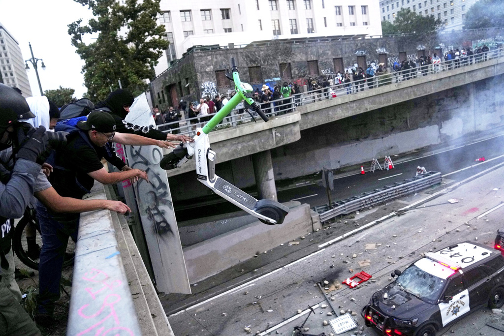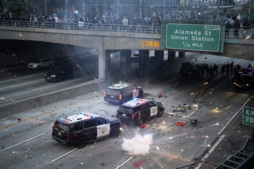 CNN指出,美聯社稍早也捕捉到,抗議人士不斷朝公路上警車丟擲異物與煙火的畫面,畫面中洛杉磯員警站在橋下,似乎是為了躲避橋上的抗議人士。
