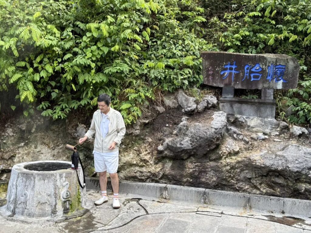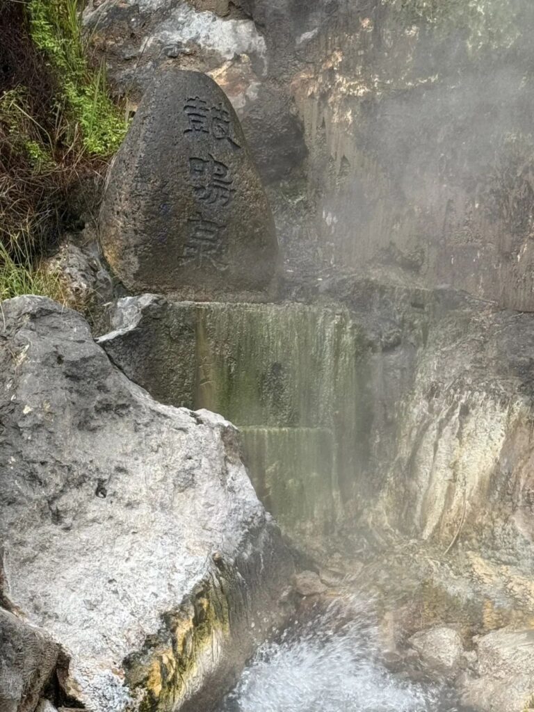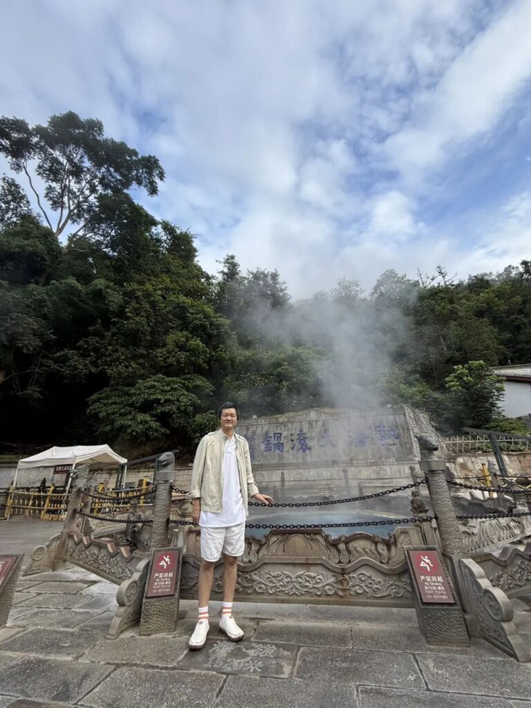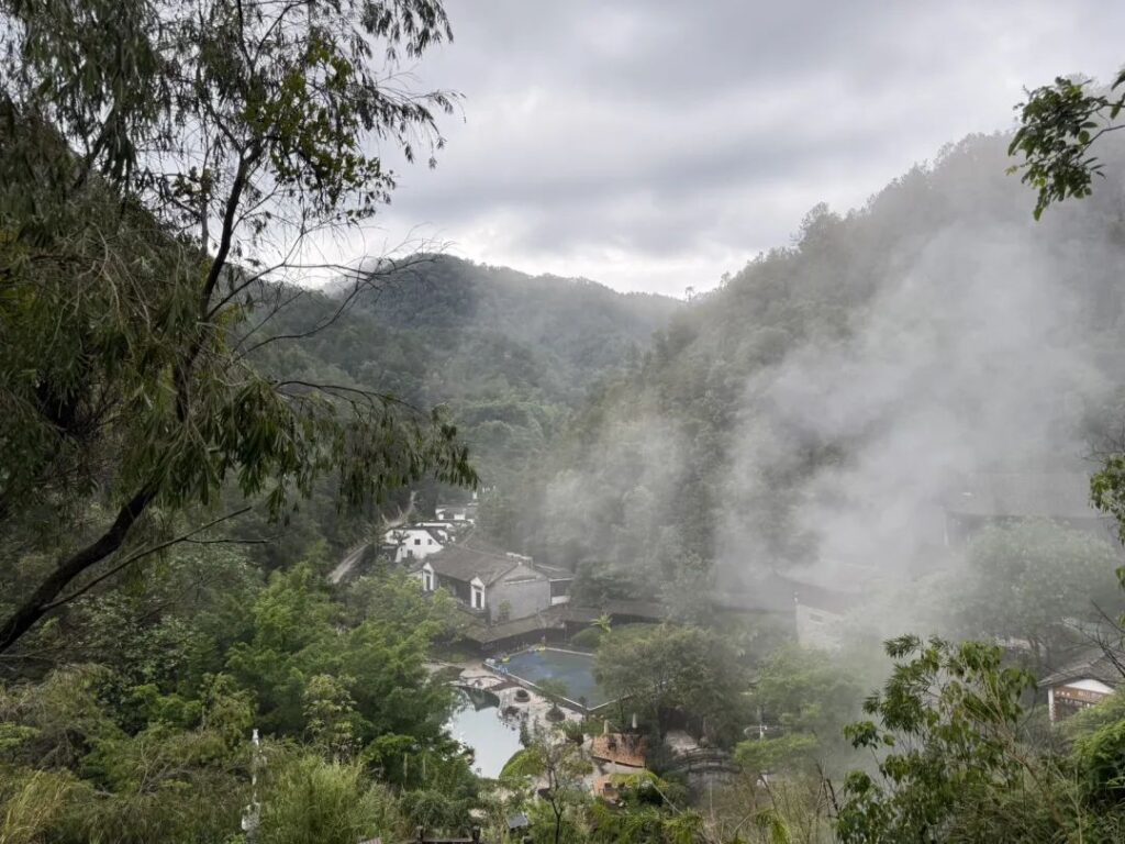 只有溫泉蒸騰的白霧,