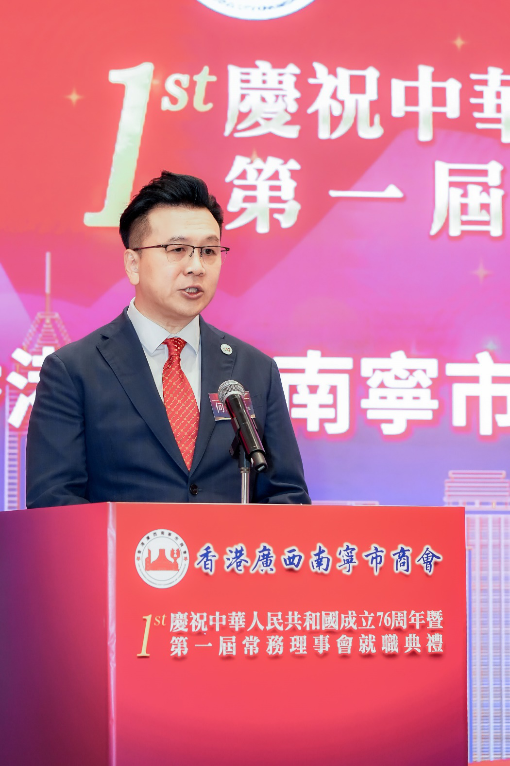 陳百里副局長致辭時肯定了商會成立對桂港兩地經貿發展的促進作用,並表示南寧市是中國與東盟的重要交通樞紐及出海通道,憑藉中國-東盟博覽會的戰略窗口角色成為區域合作關鍵節點。他強調,香港應善用國際網絡及專業服務優勢,協助內地企業「走出去」,將國際企業「引進來」,深化企業協作,共同推動桂港經貿深層次發展。