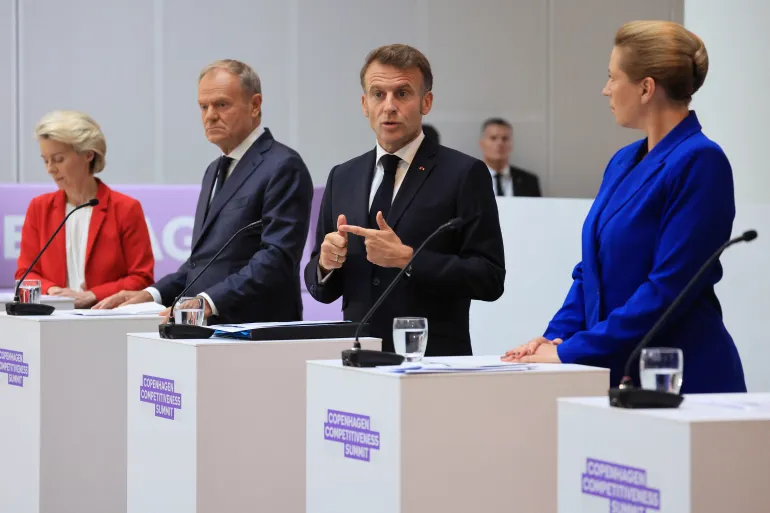 (由左至右)歐盟委員會主席烏蘇拉·馮德萊恩、波蘭總理唐納德·圖斯克、法國總統埃馬紐埃爾·馬克龍與丹麥首相梅特·弗雷澤里克森,於2025年10月1日在丹麥哥本哈根競爭力峰會期間共同發表聲明,此次會議系歐盟國家元首和政府首腦非正式會議間隙舉行(法國媒體)
