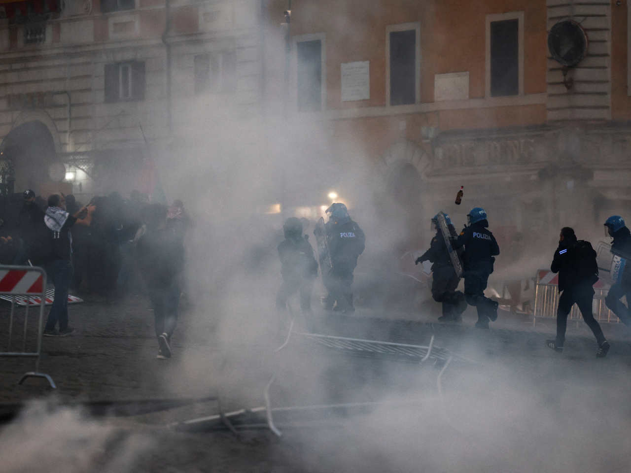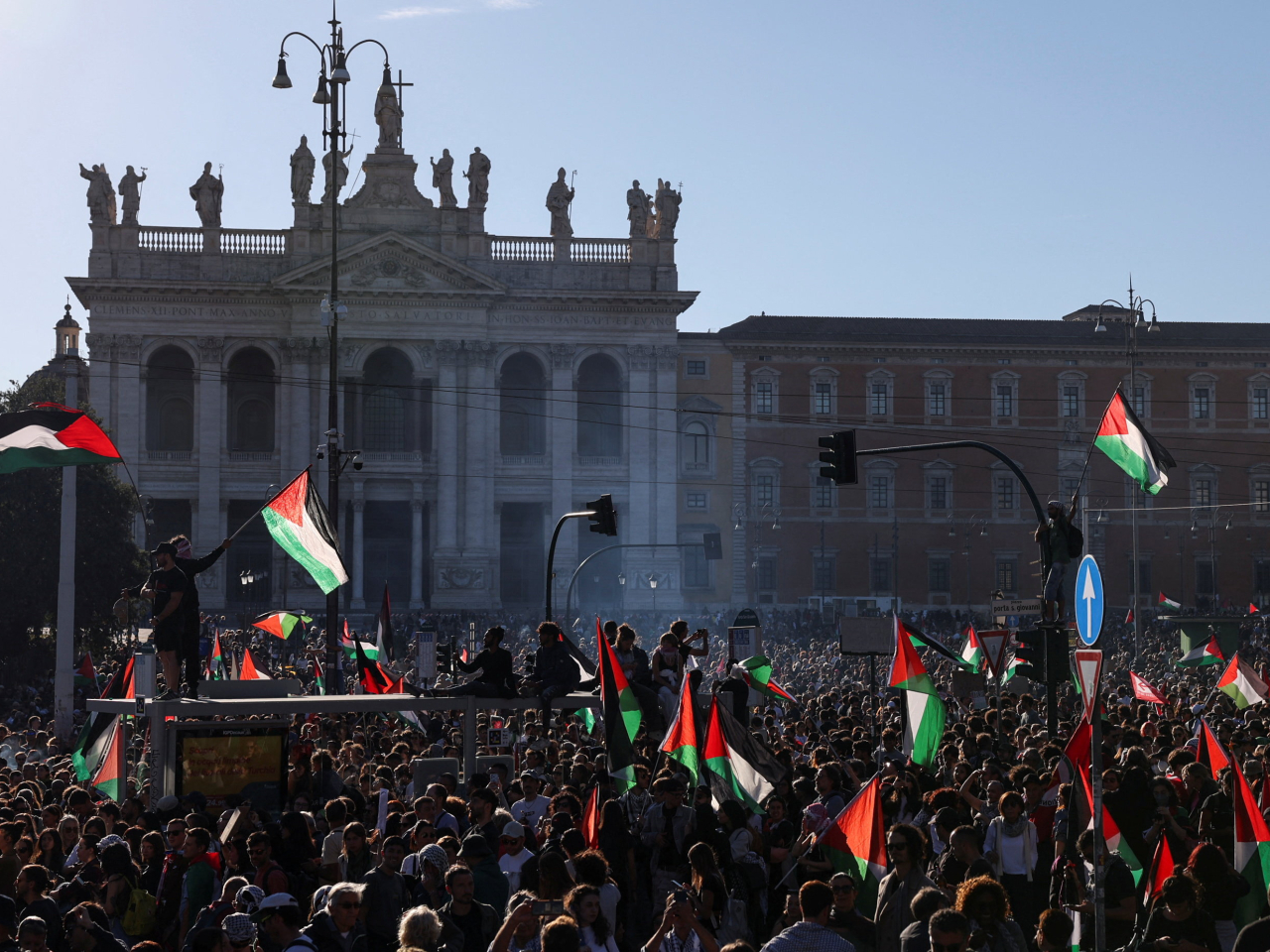 在羅馬,大批身穿防暴裝備的警員到示威現場戒備。(路透社) 在羅馬市中心,民眾舉起標語及巴勒斯坦旗幟示威抗議。(路透社) - 西班牙亦有多場支持巴勒斯坦的抗議活動,其中在巴塞羅那,當地警方說有約7萬人上街。愛爾蘭首都都柏林市中心有數千人遊行,紀念加沙遭受種族滅絕兩周年。法國巴黎亦有約1萬人聚集。英國倫敦有人不理會勸喻上街聲援,至少355人被捕。