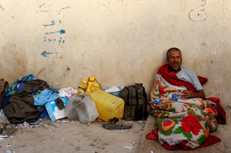 一名流离失所的巴勒斯坦人坐在加沙中部的路边(路透)