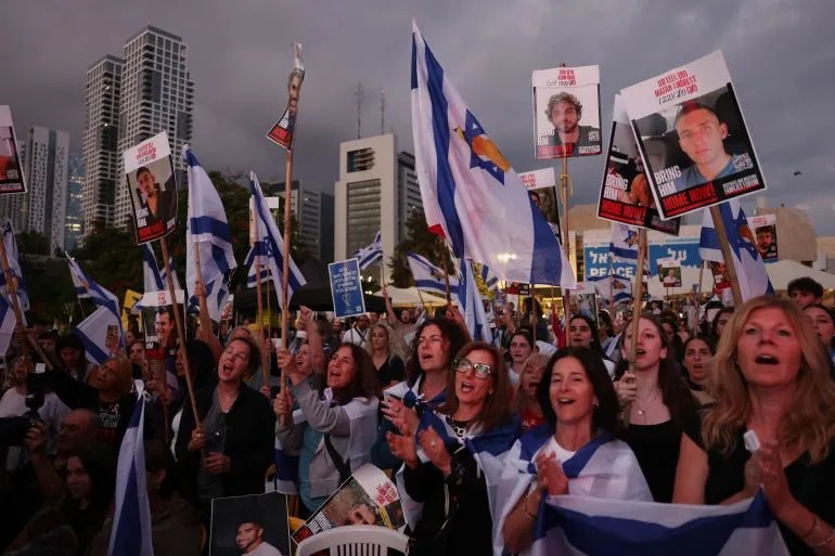 数百人聚集在特拉维夫的人质广场(Hostages Square),他们欢呼雀跃,挥舞着以色列国旗,并高举着人质的海报。