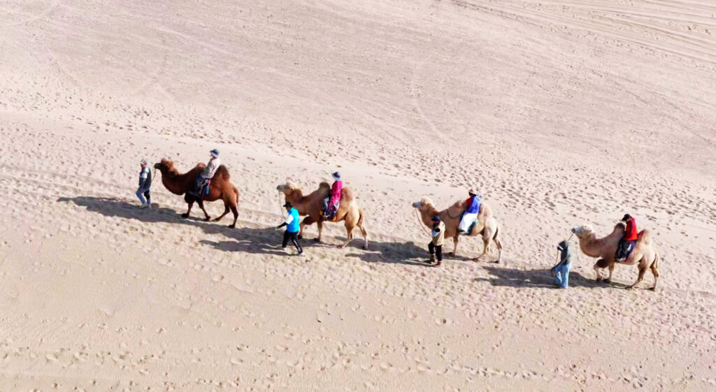 位於內蒙古自治區阿拉善地區的東南部,介於賀蘭山和雅布賴山之間。騰格裏沙漠雖然很大,但經常可以見到駱駝隊伍從湖盆中經過。圖為本人於2025年10月在其中的一個湖盆裏拍攝到的一群駱駝。