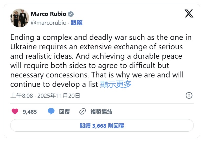 盧比歐19日深夜在社媒X上發文,稱結束俄烏戰爭需交流「嚴肅且務實的想法」,雙方都必須接受艱難讓步。