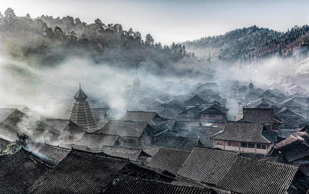 作品說明:貴州黔東南,構圖以錯落屋頂鋪展,塔樓爲視覺峰點,借霧氣分層,構建 “遠近虛實” 的空間秩序;色彩用青灰調統壹,霧氣作淡墨暈染,複刻古畫 “煙岚輕籠” 的氣韻;光影因霧柔化明暗,讓古寨似從曆史深處浮出;主題將建築、自然、時間共融,傳遞 “歲月沈澱的東方意境”,是傳統美學與攝影語言的極致共振,每縷霧都在訴說古寨的文化厚度 。