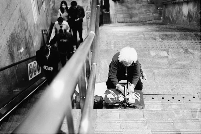 作品說明:金屬扶梯裹挾著城市的步履匆匆,石階之上,老嫗指尖輕撚茉莉,於快節奏的喧囂中堅守一份靜。這份慢,是不隨時代疾行的從容,是手作裏沉澱的匠心,讓市井煙火有了最珍貴的詩意底色。2024年5月拍攝於重慶某地鐵站。