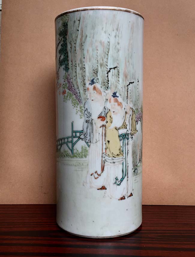 回到高心田的這件淺絳彩人物帽筒,“登仁壽域”作為銘文出現,具有了獨特的藝術與社會功能: