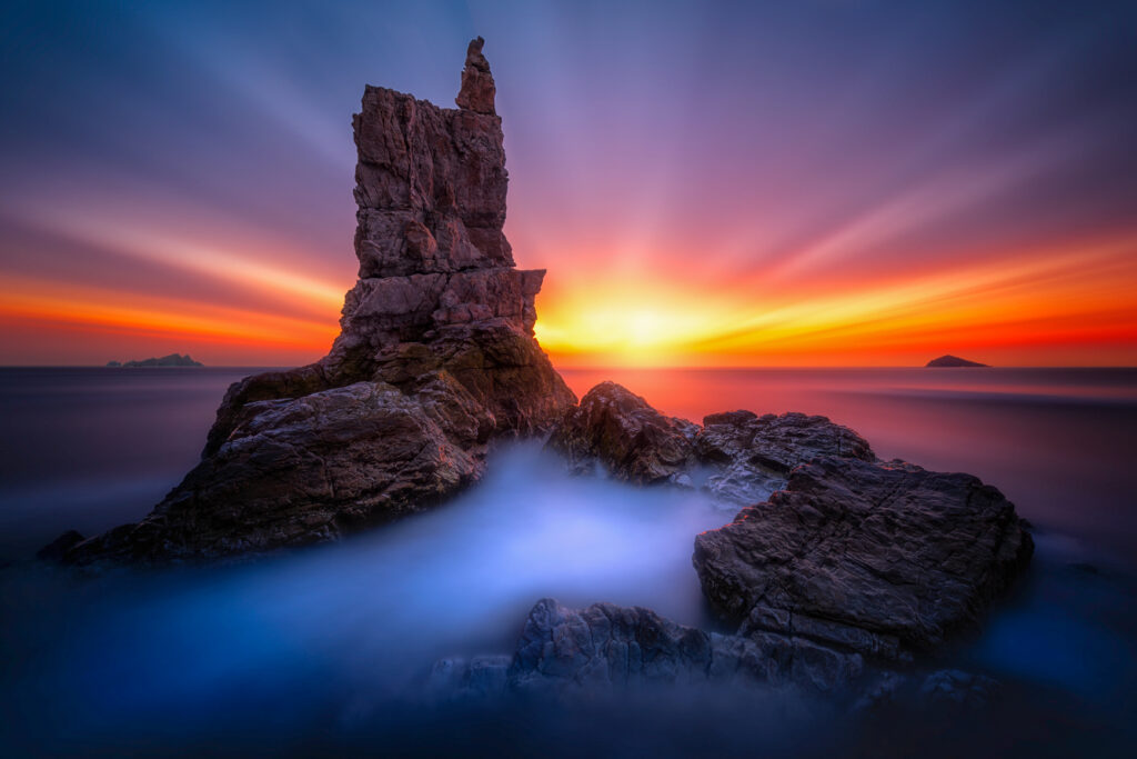 作品說明:攝影作品《將軍石晚霞》,表現的是大連西湖嘴將軍石晚霞。將軍石位于遼甯省大連市旅順口區雙島鎮西湖嘴西台山下的海岸邊。自然天成的巨大礁石,形如領兵打仗的大將軍。 據傳是爲紀念明朝遼東總兵毛文龍而得名”將軍石”。創作這幅作品,選擇了農曆十八海水漲大潮的 晚霞升起時分(火燒雲),佳能R3相機,廣角(16mm)鏡頭,曝光速度30秒慢門拍攝,使作品上的晚霞和海浪拍攝出凝固、拉絲的效果。