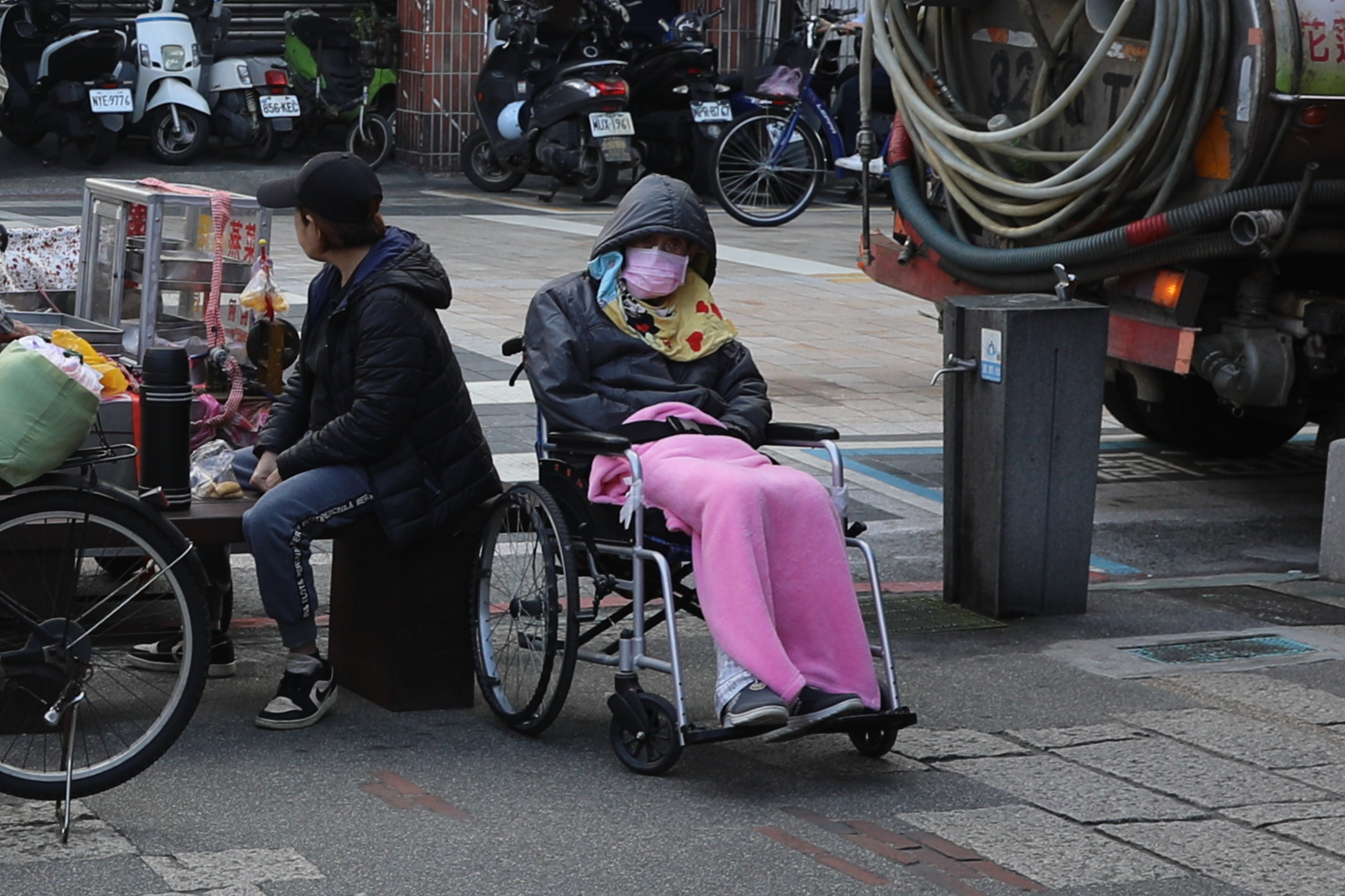 走在臺北萬華的老街區,隨處可見白髮長者在路邊獨坐。剝皮寮歷史街區附近廣場上,今年82歲的陳阿嬤(閩南語中對年長女性的昵稱)裹著厚外套,坐在輪椅上休息。陳阿嬤跟記者說,她的三個孩子都不在臺北工作,最遠的在高雄,“他們每月會回來看我一次,平時家裏只有我和護工”。