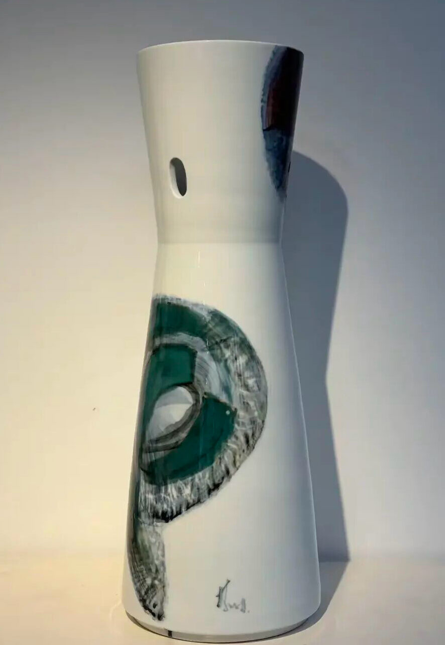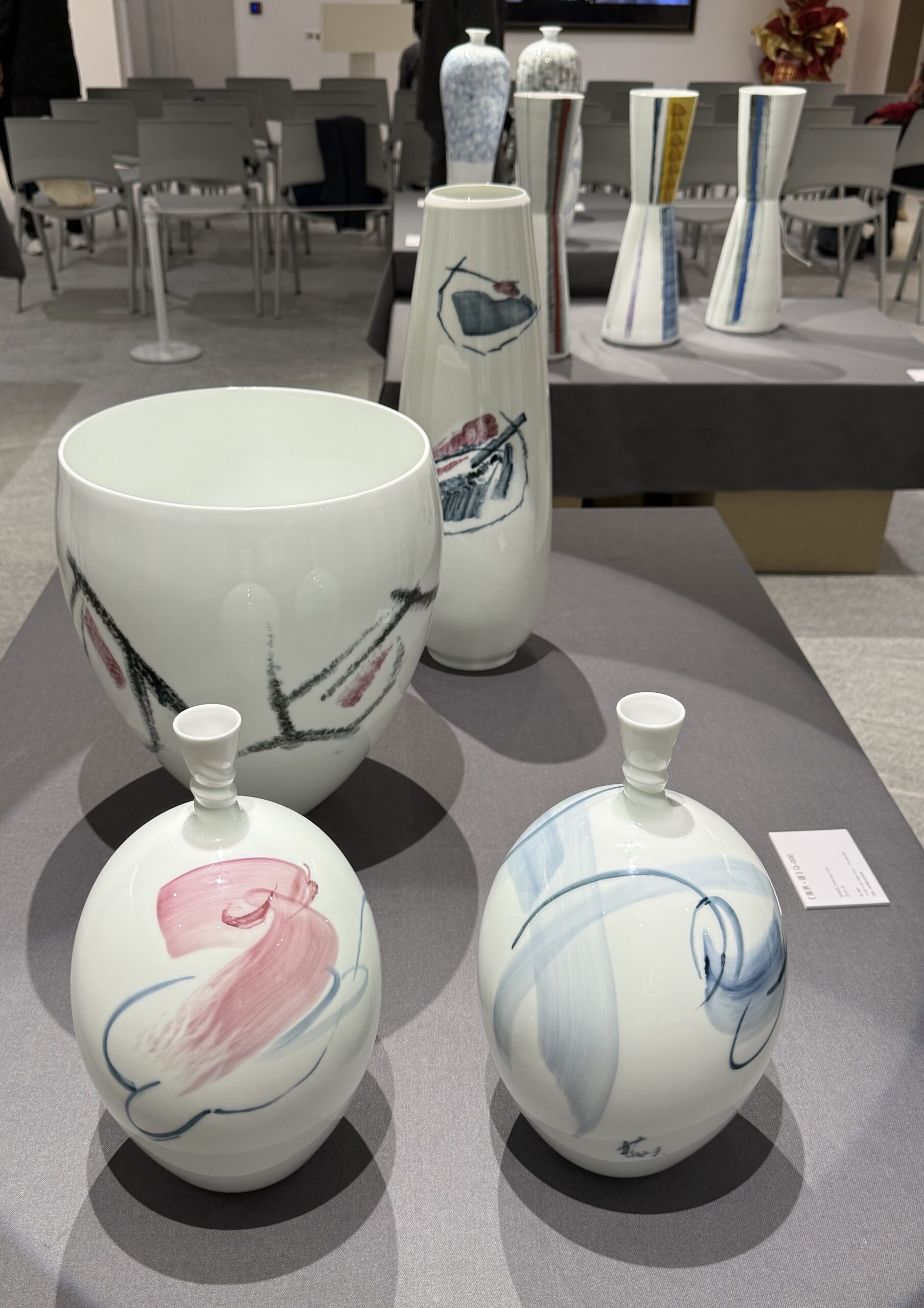 林學明,這位跨越藝術、設計與空間實踐的當代名家,身兼資深設計師、集美組設計機構聯合創始人、中國建築學會室內設計分會名譽副理事長,不僅是中國室內設計領域的奠基人,更在陶瓷藝術領域開闢出新天地。畢業於中央工藝美術學院的他,深受新中國第一代設計教育家影響。其創作核心始終圍繞著材料的生成結構與時間性的深邃探索。從上世紀八十年代初投身陶藝與材料實驗開始,四十餘年深耕藝術與設計領域,從廣州長隆酒店到青島地鐵線路設計,作品遍布各地並斬獲國內外無數大獎。在陶瓷創作中,他將醴陵釉下五彩的傳統釉色、抽象紋樣與其獨創的書寫性筆法解構重組,融入當代抽象繪畫語言。本次展出的“新五彩”系列,是其高度系統化的跨媒介方法論的進一步拓展,它使繪畫、陶藝、裝置與空間實踐得以在同一生成邏輯下展開,完美詮釋“傳統工藝的當代美學轉換”。