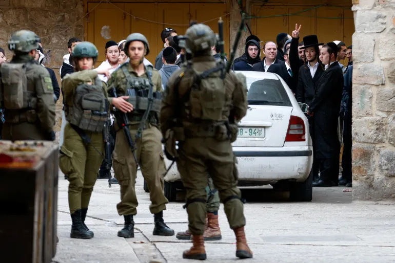 2026年1月24日,在以色列佔領的約旦河西岸城市希伯崙,以色列士兵在定居者每週例行巡視期間站崗。路透社/穆薩卡瓦斯馬