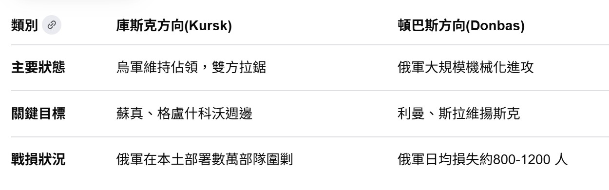 邊境突襲:俄羅斯「北方」集團軍近期對蘇梅邊境發動了跨境戰術突擊,宣稱奪取了3 個邊境定居點以緩解庫斯克壓力。