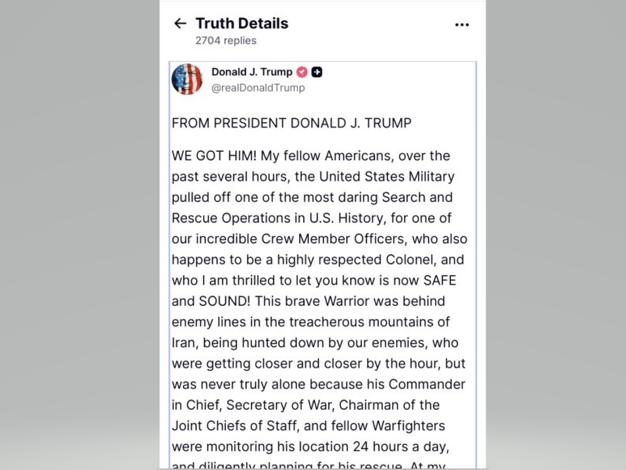 • 川普在社交平台發文說,美國軍方完成美國歷史上最大膽的搜救行動之一,派出飛機攜帶武器,營救在伊朗失蹤的第二名美軍機師,他受了傷,但會康復。